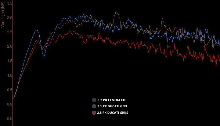 Fenom Performance uitlaat, Fenom CDI en een Malossi Multivar met 6,1 gram rollen en een witte drukveer. Topsnelheid 64 km/u gps dus op teller +-68 km/u! 3.2 pk op de testbank gemeten met een Fenom CDI, met een Ducati CDI onbegrensd 3.1 pk en met een ducati grijze cdi 2.5 pk.