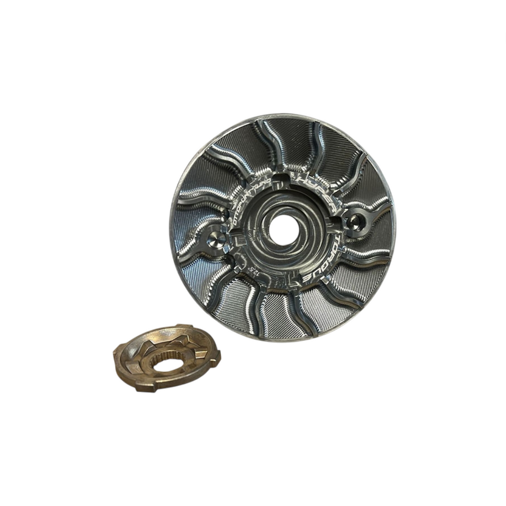 Deze semi-poelie aan de variatorzijde is uitgevoerd in hoogwaardig Ergal, met een Hyper Torque 12,5° hoek en een diameter van 105mm. Let op! Elektrische start is met deze starterkrans niet mogelijk! Compleet geleverd met kickstartmechanisme, perfect geschikt voor Piaggio 70-100cc transmissies.