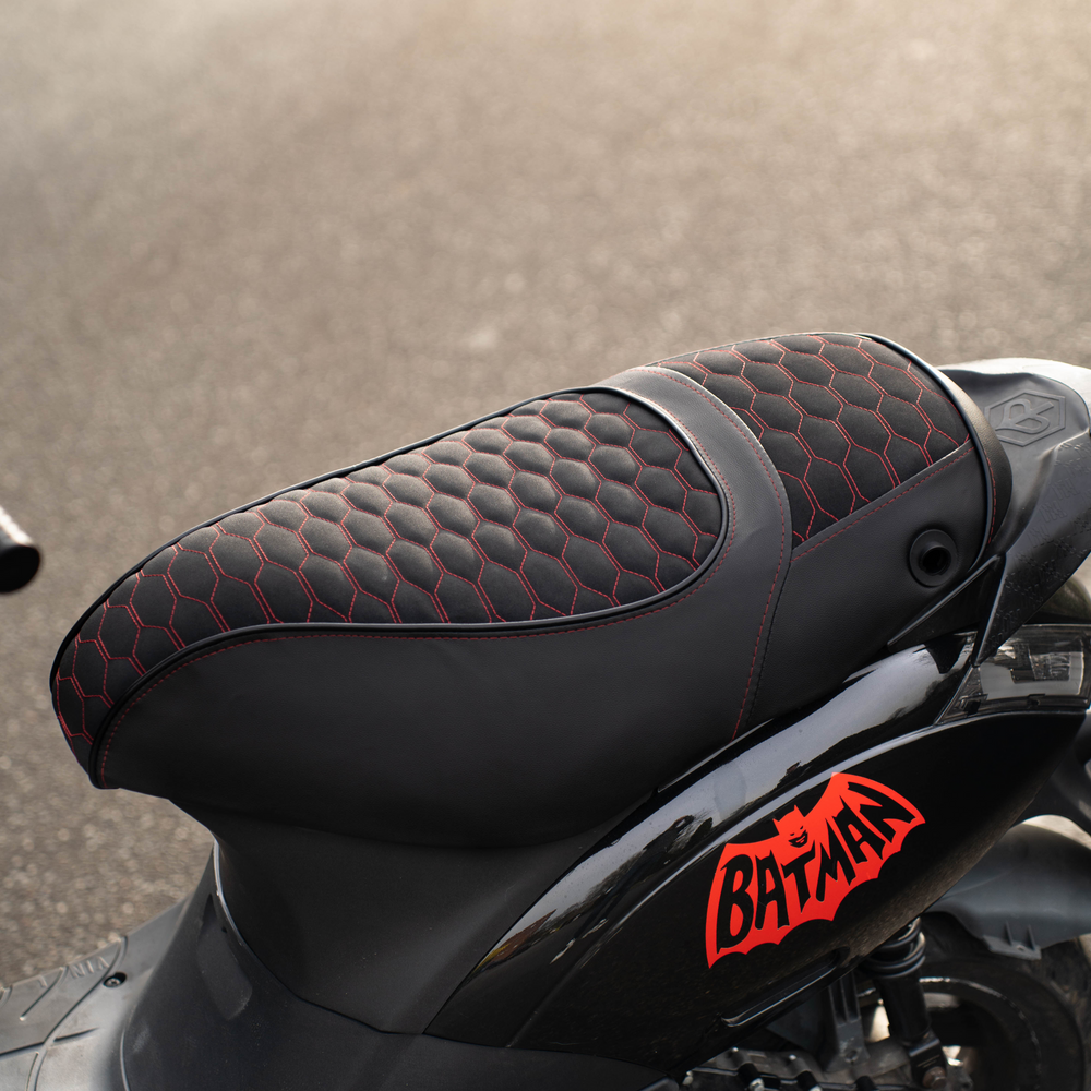 De Fenom Zadelhoes Alcantara Look Rood geeft jouw Piaggio Zip een luxueuze en frisse uitstraling. De zachte alcantara-look stof biedt extra grip en comfort tijdens het rijden, terwijl de strakke pasvorm het zadel een premium afwerking geeft. Een perfecte keuze om je Zip een unieke, stijlvolle upgrade te geven.