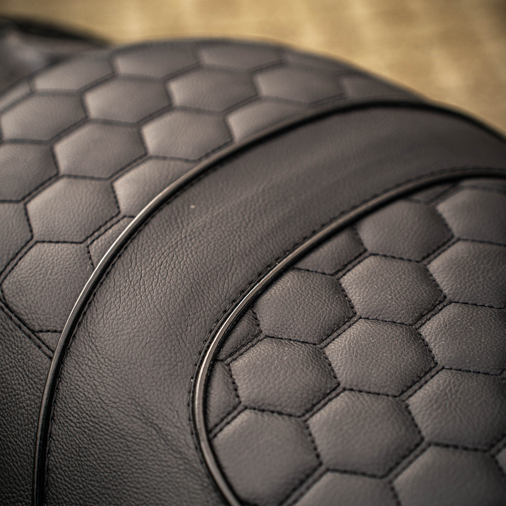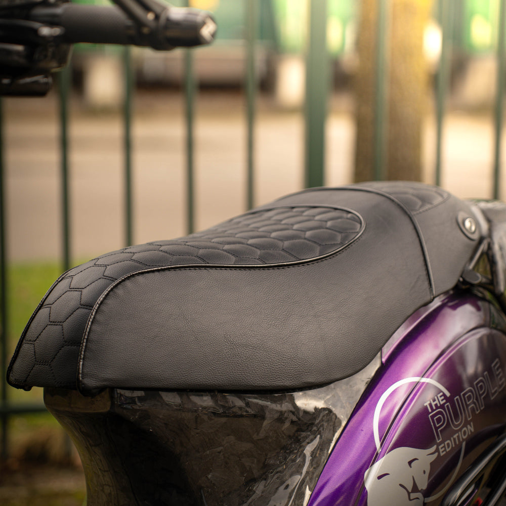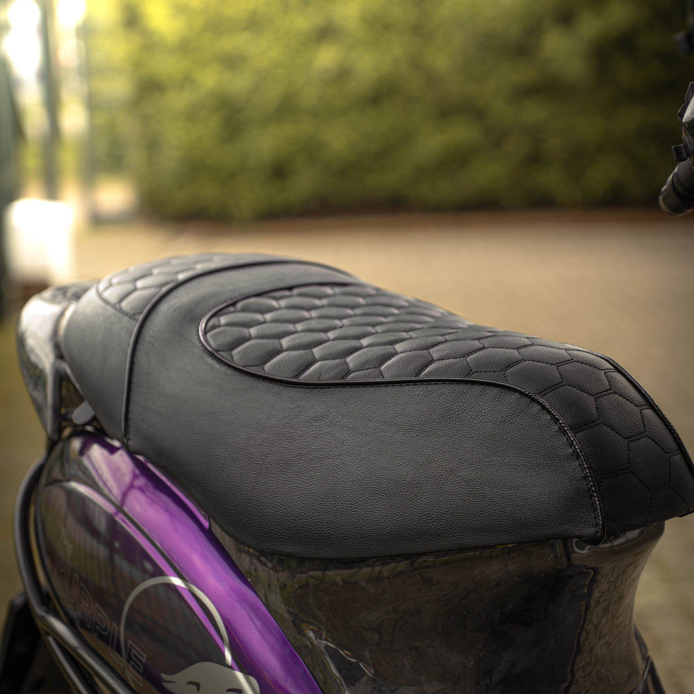 Upgrade je Piaggio Zip 2T/4T met de Zadelhoes RS Zwart! Gemaakt van hoogwaardig PU-leer met een strakke flat finishing, glanzend zwarte biezen en een stijlvol hexagon patroon. De zwarte stiksels zorgen voor een sportieve en exclusieve uitstraling. Handgemaakt met oog voor detail en een perfecte pasvorm. Bestel nu en geef je scooter een unieke look!