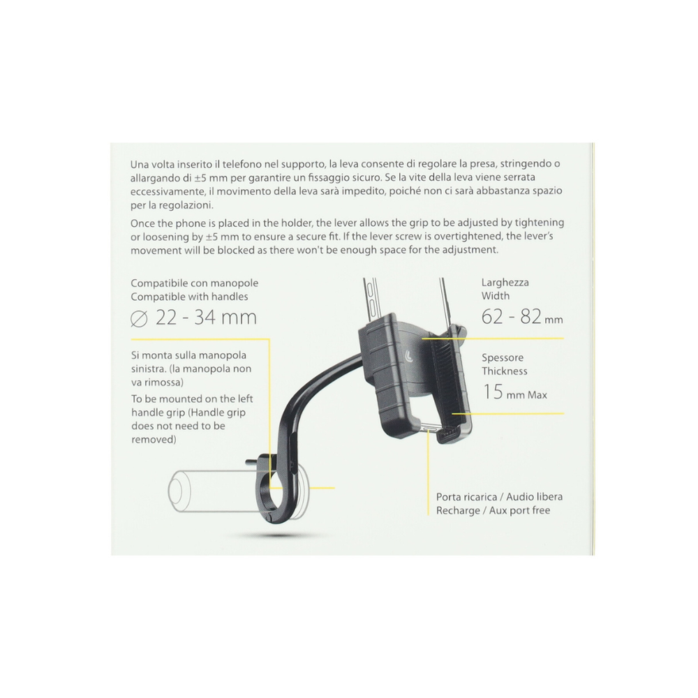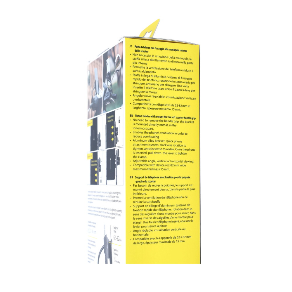 The Phone Holder Lampa handle attachment left is intended for scooters and fat bikes. This holder is mounted directly on the inner part of the handle, without having to remove the handle. Thanks to the quick mounting system, the adjustable viewing angle (vertical or horizontal) and the design that allows ventilation around the phone, your device stays sturdy and cool while driving.