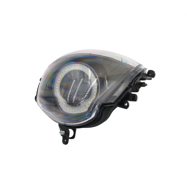 Give your scooter a sleek and modern look with this complete phenom Angel Eye headlight unit, including built-in Angel Eye-Ring. This headlight delivers high light output, has a CE quality mark and lasts up to 6x longer than halogen lighting. Thanks to the color temperature of 6000K white light you drive safer and with more vision, while your original light switch will continue to work.