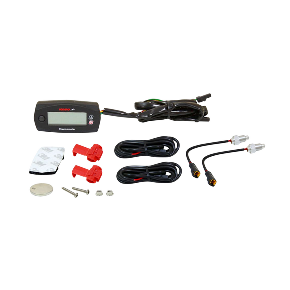 The KOSO temperature meter 0-250 degrees is an advanced digital counter with a double temperature connection, ideal for measuring the temperature on two points, such as with a 2-cylinder engine. With a stylish white lit display, this meter offers accurate measurements and simple readability. The set comes complete with a mounting manual, connection set, and two PT 1/8 temperature sensors (suitable for Minarelli, with a run -up adapter also fitting on other models, see all adapters on our website). Compact and sustainably designed with dimensions of 60x30x11 mm and a battery of the CR 2032 type.