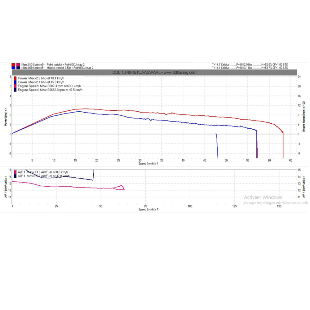 Combineer je zowel de Polini variateur + Polini ECU, dan loopt deze setup zelfs tot 7 km/u harder dan de Malossi variateur + Polini ECU combinatie.