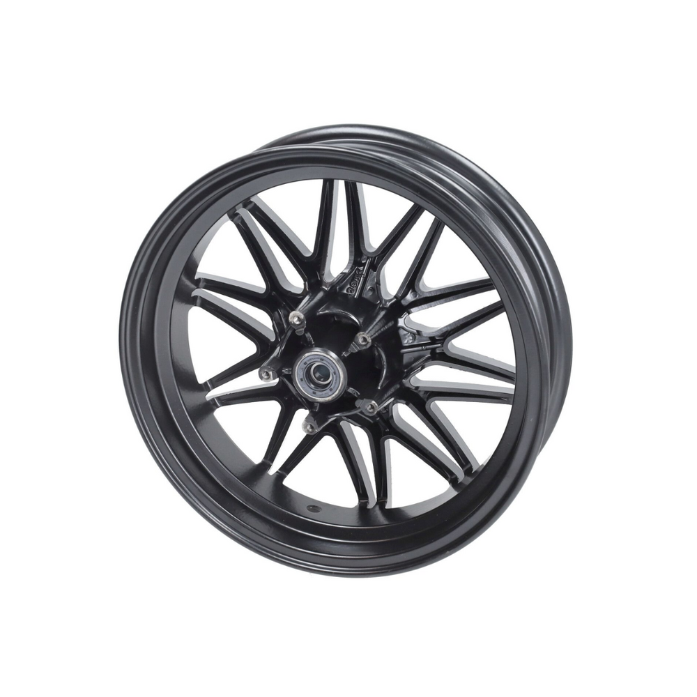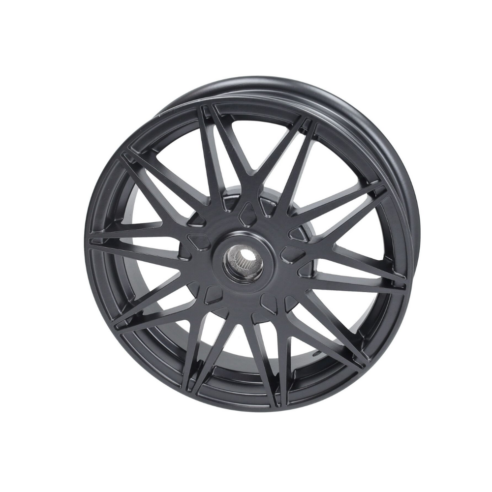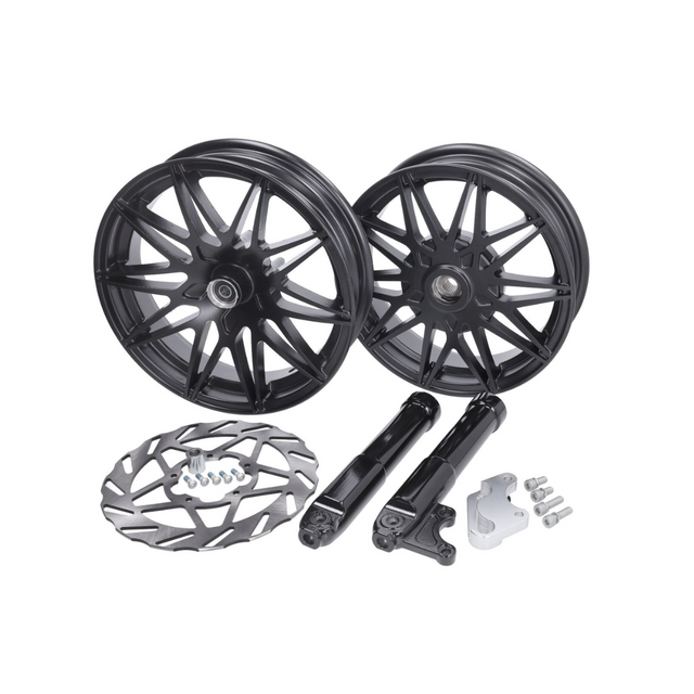 Aggiorna la tua zip Piaggio con questo set di ruote speciali Matt Black per un look sportivo ed esclusivo. Questo set completo contiene tutto ciò di cui hai bisogno: un cerchio anteriore da 12 pollici e un bordo posteriore da 11 pollici in nero Matt Black, tra cui un disco freno di grandi dimensioni, un adattatore per pinza, le gambe della forcella anteriore estesa e il materiale di montaggio richiesto.